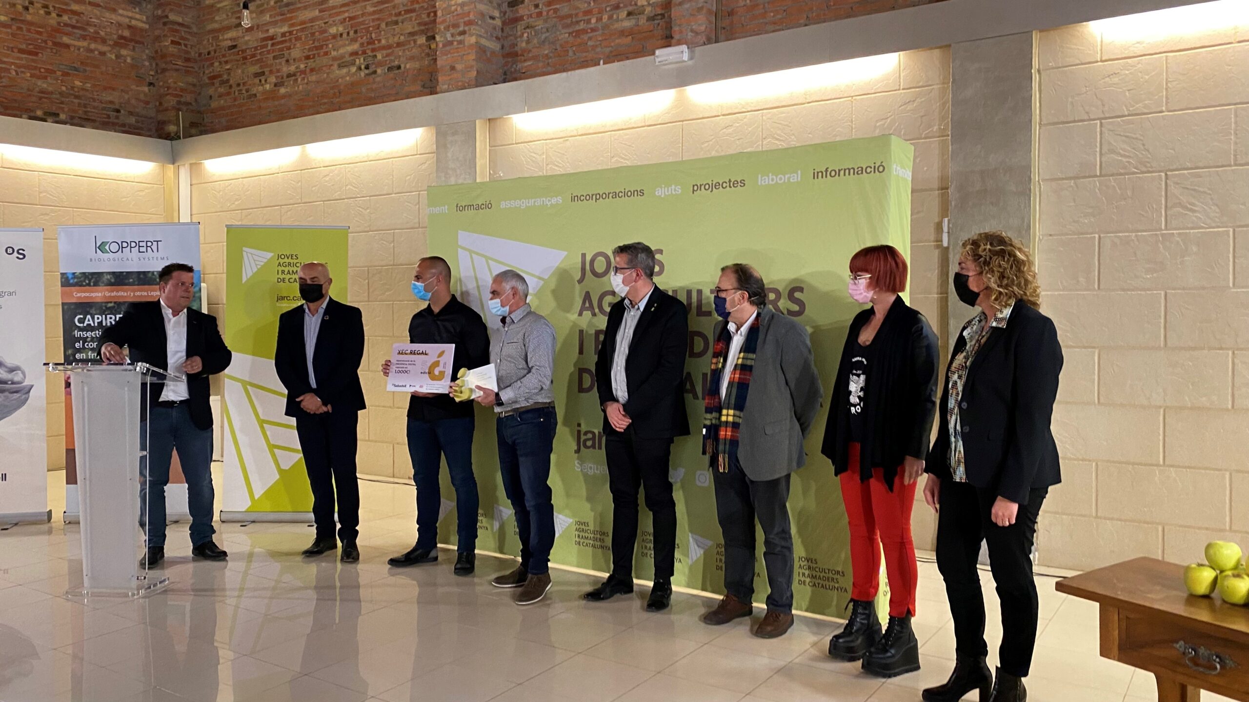 Sergi Balué, cap sectorial de la Fruita Dolça de Joves Agricultors i Ramaders de Catalunya, ha fet entrega avui del guardó a la Millor Poma Golden 2021 als representants de Miralcamp Fruits, Llorens Pedrol, vicepresident, i Àlex Herrera, director comercial, en nom de la cooperativa lleidatana. Situada al cor del Pla d’Urgell, Miralcamps Fruits va néixer l’any 1981 per conservar, confeccionar i comercialitzar la fruita dels seus socis. Àlex Herrera ha expressat la seva sorpresa i alegria en tornar a proclamar-se guanyadors d’aquest concurs.