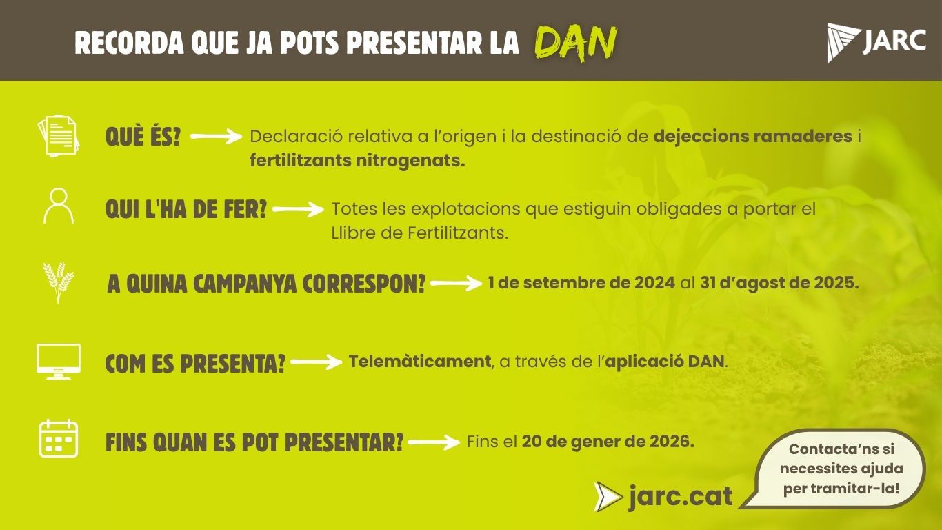 Recorda que ja està obert el termini per presentar la Declaració Anual de Nitrogen (DAN), corresponent al període comprès entre l’1 de setembre de 2024 i el 31 d’agost de 2025.